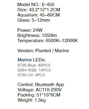 L x B x H: 43,2 cm x 12 cm x 1,2 cm. Passer til en aquarium på 45 til 60 cm. Vægt: 1,5 kg.